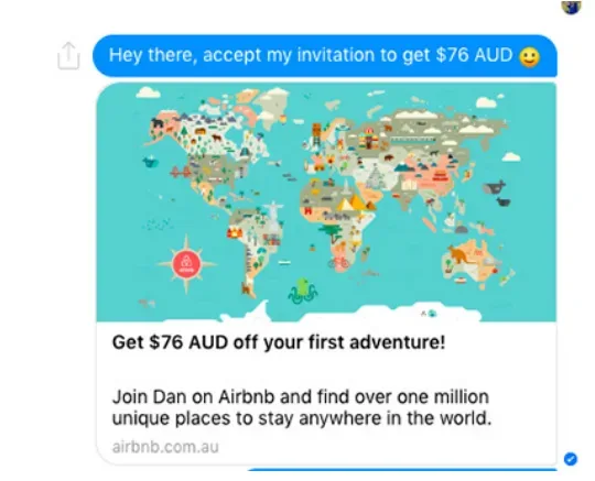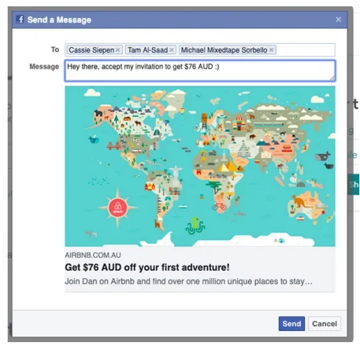 Facilitando o processo dos usuários compartilharem nessas redes, o Airbnb não fica preso ao limite de indicação 1 para 1 e incentiva a indicação de 1 para muitos, onde o usuário pode compartilhar um post no Facebook ou enviar a mensagem personalizada para vários contatos e grupos de uma vez, e assim obter vários novos clientes com menos esforço