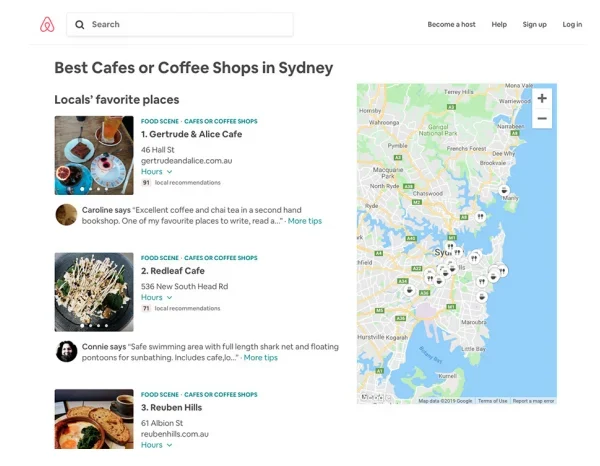 Então o site retorna uma lista classificada de recomendações com comentários de anfitriões do Airbnb e um mapa do Google com marcações correspondentes a cada lugar
