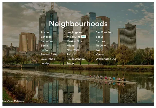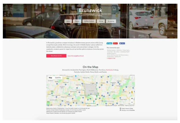 Com curadoria como um feed de blog de bairros dentro de uma cidade escolhida, Neighborhoods é uma versão visual de um diretório de rua à moda antiga. Se você selecionar Melbourne, por exemplo, existem 19 bairros para selecionar, com filtros como “Espaços Verdes” e “Perto da praia”.