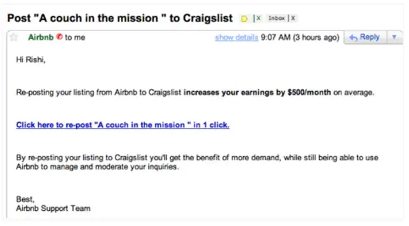 Com isso em mente, o time do Airbnb teve a ideia de criar um bot que visitava o site do Craiglist e criava um anúncio com todas os dados do host, então ele enviava essa URL por e-mail para eles, pedindo para que publicassem a oferta no site.