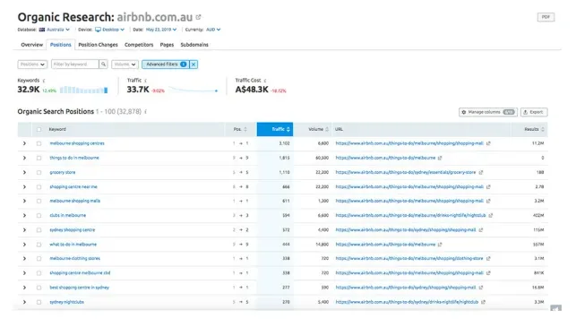 Quanto à forma como as pessoas estão chegando a esta seção do site, isso provavelmente é por meio de pesquisas orgânicas. Por exemplo, um dos guias do Airbnb está na posição #1 organicamente para o termo “centros comerciais de Melbourne”.