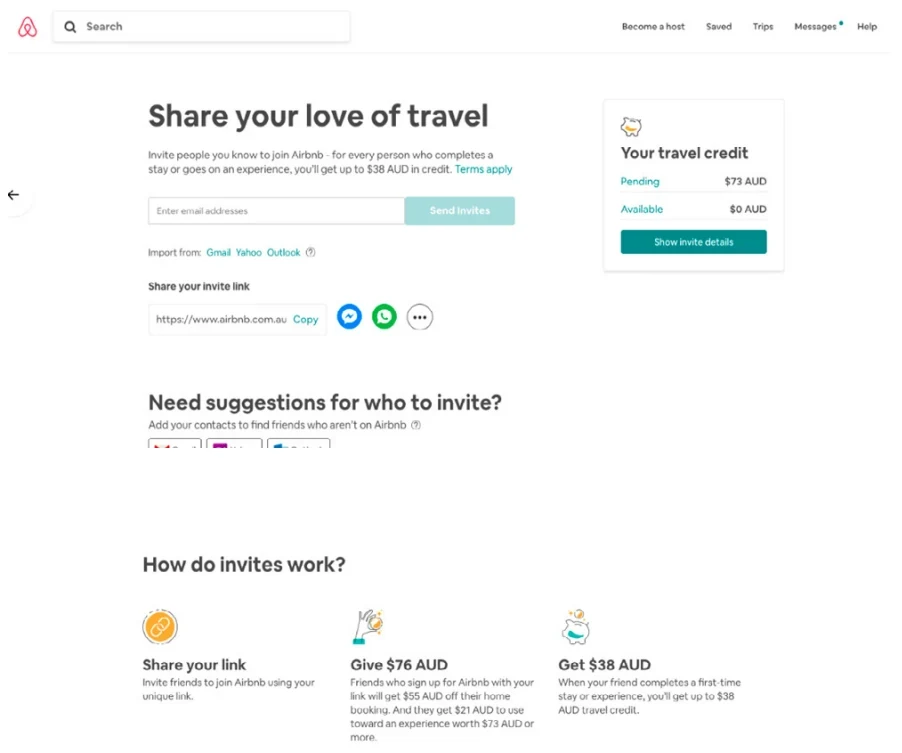 Indicação – Para o Airbnb, criar um programa de indicação se trata de descobertas contínuas, testes e otimização de um dos mecanismos de aquisição de clientes mais famosos e eficazes do mundo. Eles conseguiram evoluir e criar um programa extremamente fácil de usar e que funciona muito bem.