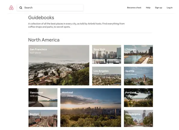 Esse conteúdo realmente diferencia o Airbnb dos grandes sites de reservas de hotéis, destacando lugares interessantes em diferentes cidades. O Airbnb fez parceria com fotógrafos locais para realmente capturar a essência da área de uma perspectiva nativa, inspirando os usuários e criando uma conexão com o local.