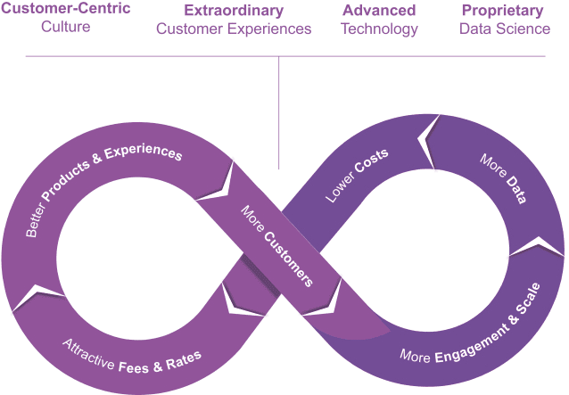 Por exemplo, à medida que expandem o ecossistema de clientes e parceiros, geram mais dados, o que permite que eles melhorem os produtos e serviços e a experiência do cliente. À medida que mais clientes existentes ficam satisfeitos com sua experiência, eles indicam novos clientes, o que, por sua vez, aumenta o tamanho do ecossistema Nu.