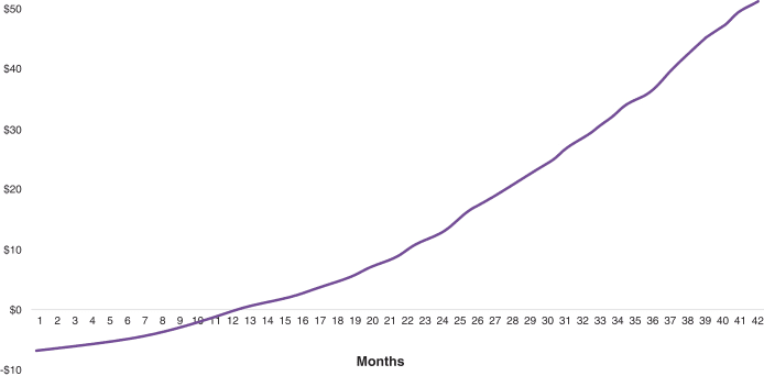 Esse gráfico mostra o cohort da relação LTV/CAC da empresa. De acordo com eles, seus clientes se pagam em menos de 12 meses, chegando a ter um ROI de 30x.
