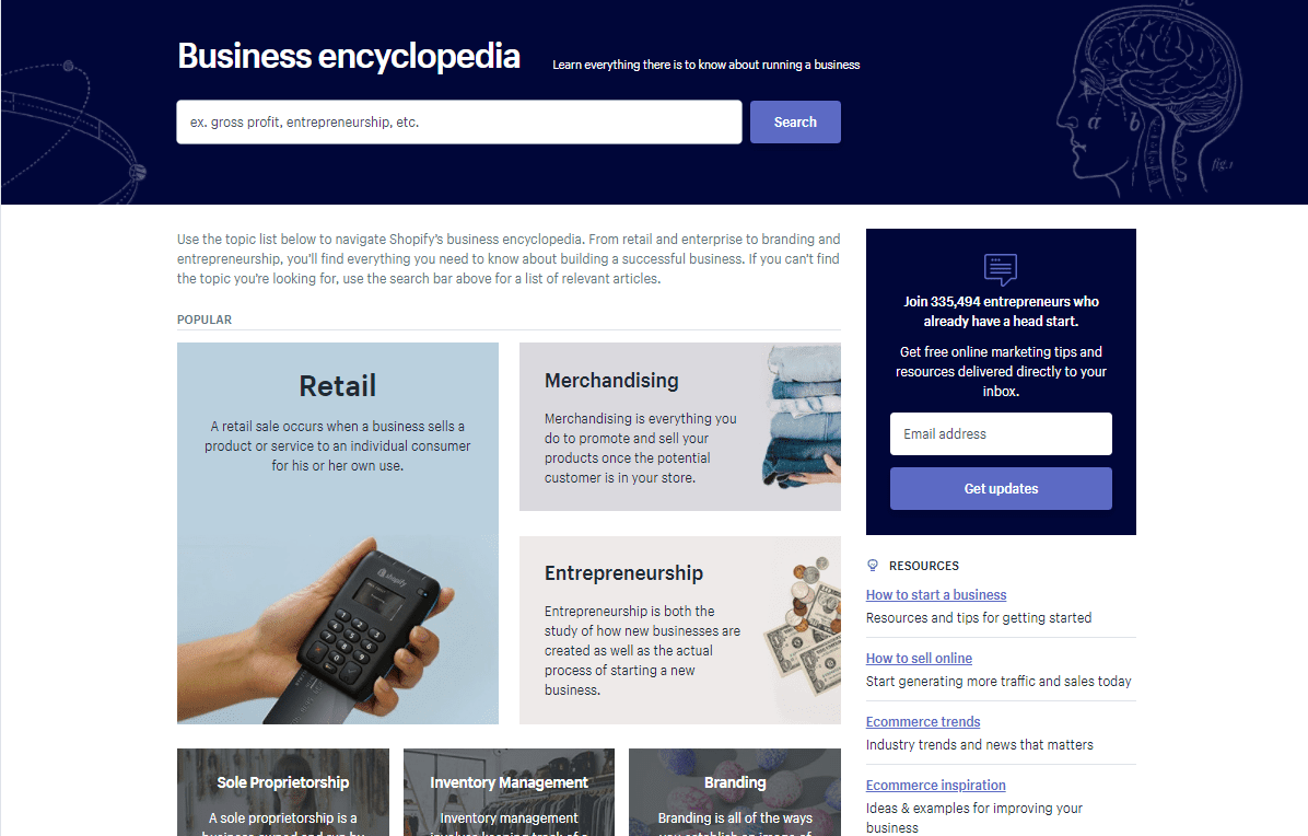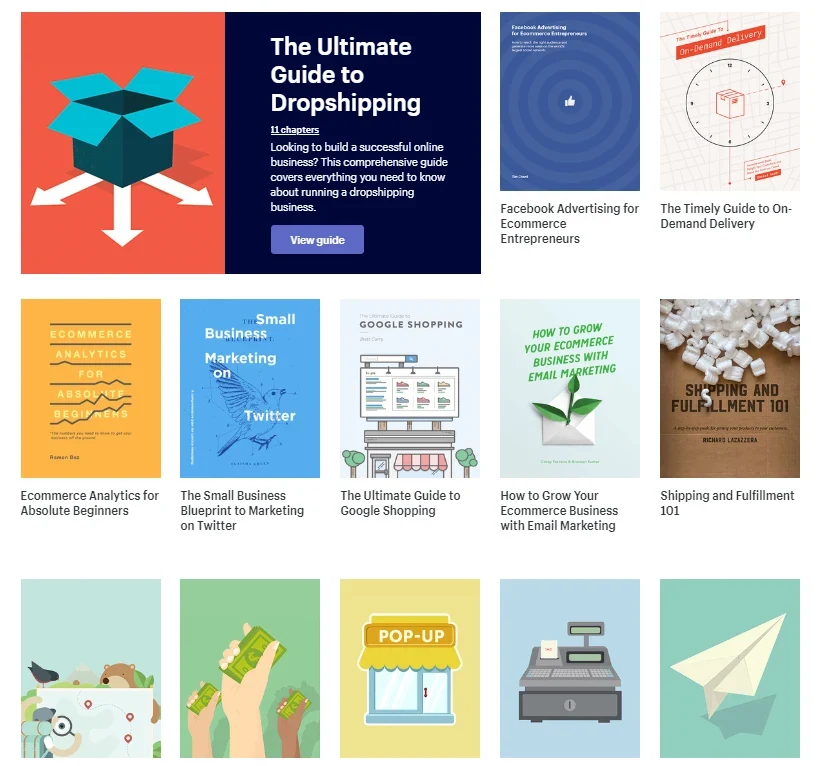 Distribuição – O Shopify entendeu o jogo da distribuição e focou em gerar valor e divulgar a solução deles no maior número de canais e formatos que eles pudessem. Chegaram a criar um blog, páginas com guias e ebooks, podcasts e até uma enciclopédia com respostas para dúvidas relacionadas a negócios
