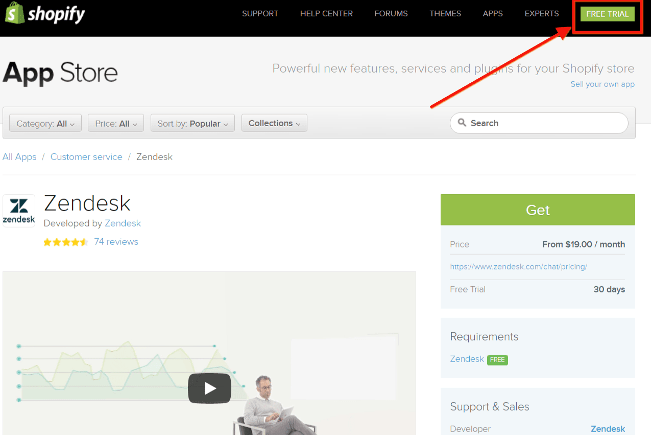 Clicando nesse link, você será redirecionado para uma página sobre o app da Zendesk dentro da loja de apps da Shopify, que possui um CTA para um teste grátis