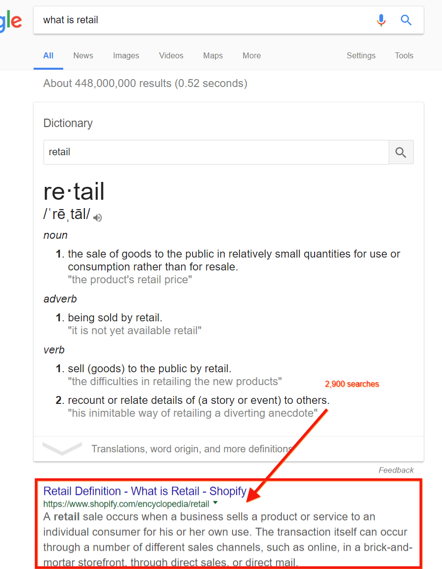 Por exemplo, se pesquisar “What is retail?” (Em português “O que é varejo?”), o Google vai retornar uma página do business encyclopedia como primeiro resultado da pesquisa: