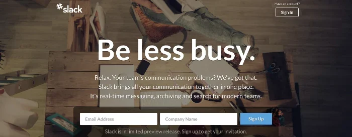 Branding – Outra grande peça desse quebra-cabeça é o Branding que o Slack construiu. Olhando a antiga página deles e matérias antigas, vemos que o Slack queria que sua marca tivesse a voz de um amigo do trabalho, recomendando uma ferramenta que era conhecido por ser o “e-mail killer”.