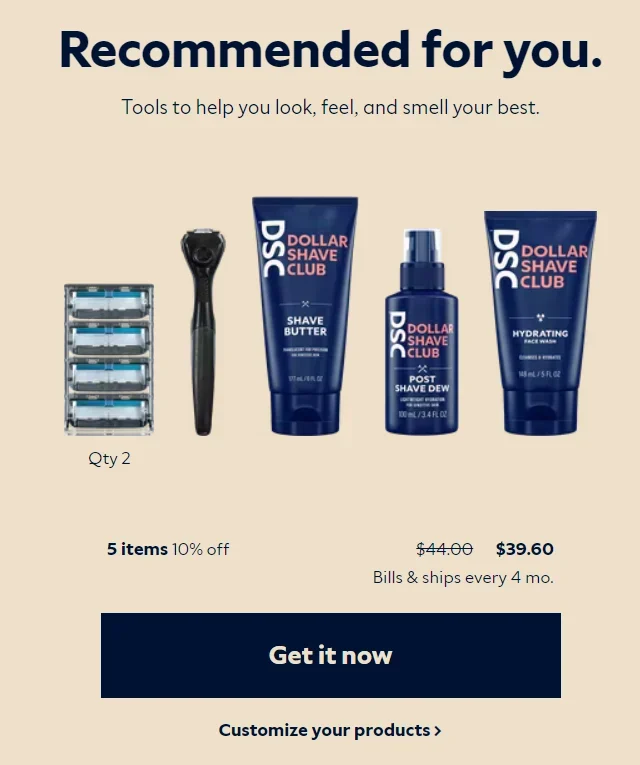 Oferecem uma solução real – Em sua essência, a Dollar Shave Club é uma marca de todos os homens com uma proposta de valor simples: Ser uma saída para as lâminas de barbear que são vendidas em farmácias e supermercados, e custam uma fortuna. Com a DSC você vai ter alternativas genéricas de qualidade sendo entregues automaticamente na porta da sua casa por apenas US$ 3,00/mês. Sem contratos ou taxas ocultas.