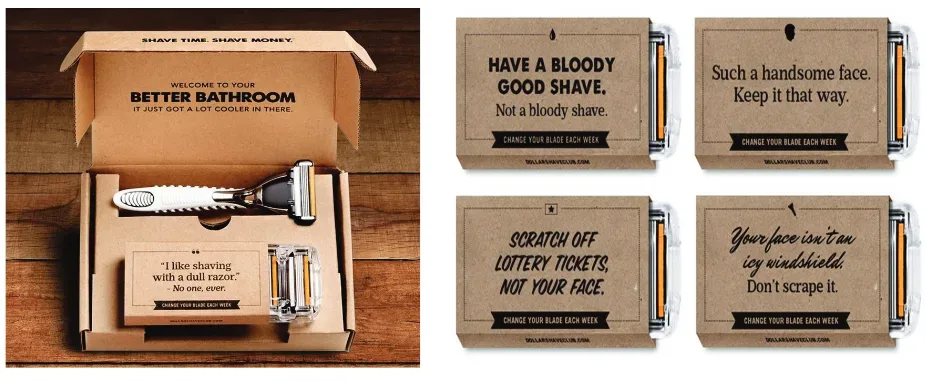 A Dollar Shave Club é uma empresa da Califórnia que possui um modelo de assinatura de produtos de higiene masculina, como lâminas de barbear e cremes para a barba. É uma das primeiras startups famosas com esse modelo de assinatura de produto físico.