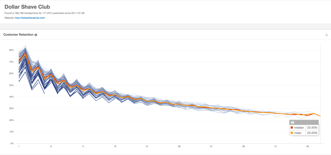 No gráfico abaixo é possível ver que em média, 23,40% dos clientes ficam retidos por pelo menos 48 meses. Quase 1/4 da base ainda continua pagando a assinatura depois de 4 anos! Agora imagine se alguns desses vieram através do vídeo do comercial, que eu comentei em cima, que teve um CAC de US$0,37. Bizarro, né?